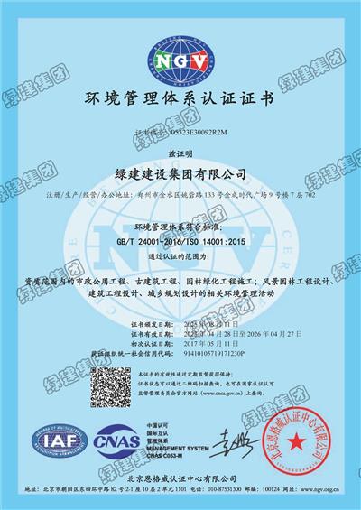 環(huán)境管理體系認證證書